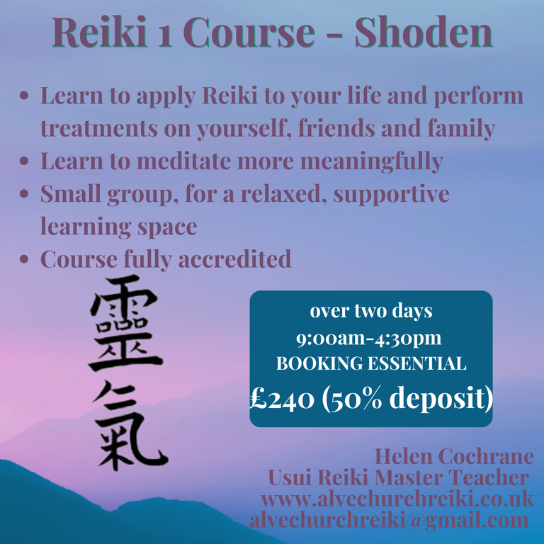 The course fee includes refreshments on both days, a comprehensive course manual, meditation prompt cards, a goodie bag, a certificate and ongoing support from Alvechurch Reiki.